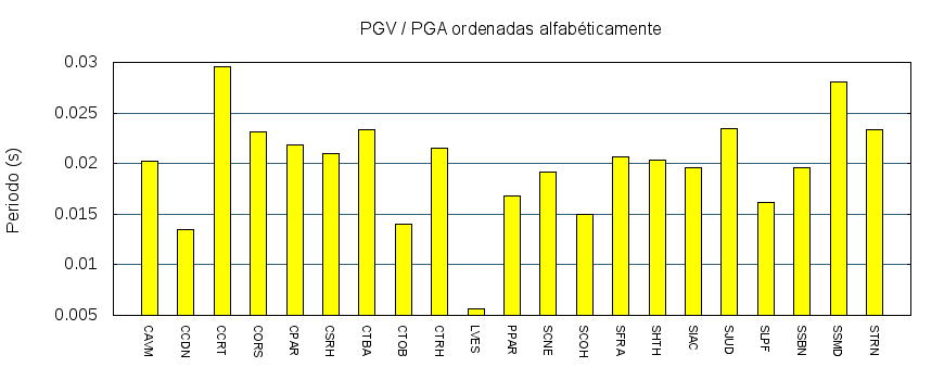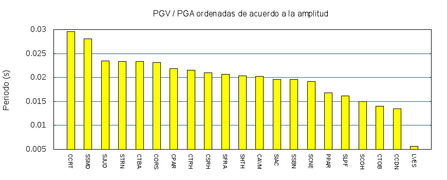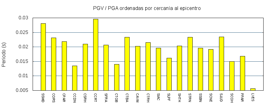 El cociente de la velocidad máxima (PGV) entre la aceleración máxima (PGA) brinda información de los periodos más significativos del movimiento del suelo. En el gráfico siguiente se muestran las estaciones ordenadas por su cercanía al epicentro. La más cercana está a la izquierda y la más lejana a la derecha. También se muestran los mismos datos en orden alfabético y ordenados de mayor a menor amplitud.