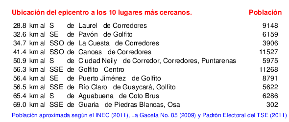 Mapa de la zona epicentral. Se muestran las poblaciones más cercanas al epicentro y fallas activas. Abajo están las distancias que hay del epicentro a cada uno de los diez sitios más cercanos y la cantidad de habitantes que poseen.