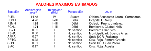 Intensidades en sitios de registro.Cada uno de los cuadrados en el mapa corresponde a la ubicación de un acelerógrafo al momento del sismo. Estos se muestran en distintos colores según la escala mostrada al pie de la figura.
