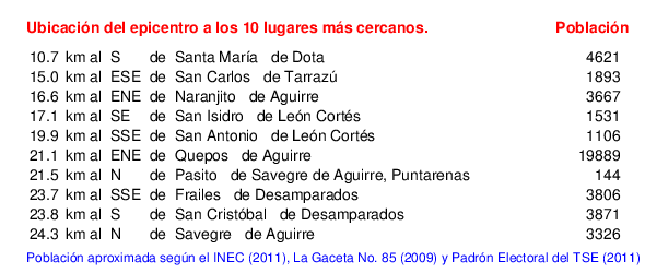 Detalle de la zona epicentral. Se muestran las poblaciones más cercanas al epicentro y fallas activas. Abajo están las distancias que hay del epicentro a cada uno de los diez sitios más cercanos y la cantidad de habitantes que poseen.