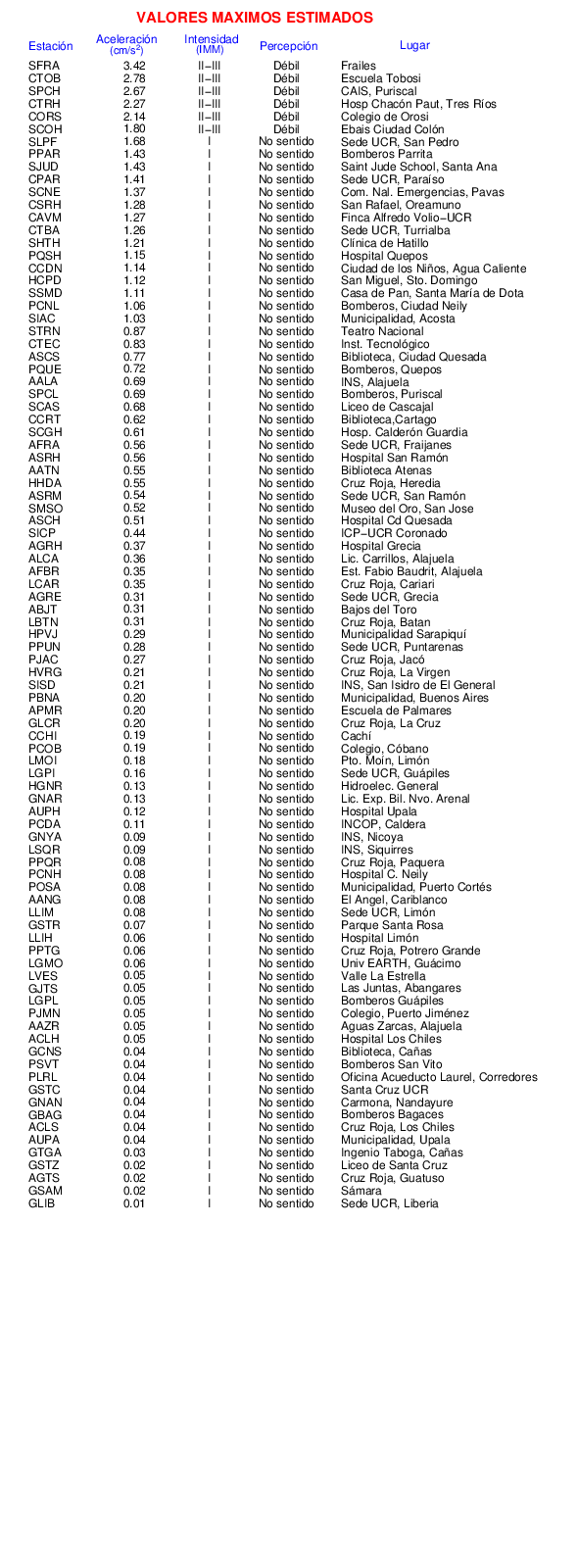 Intensidades en sitios de registro.Cada uno de los cuadrados en el mapa corresponde a la ubicación de un acelerógrafo al momento del sismo. Estos se muestran en distintos colores según la escala mostrada al pie de la figura.