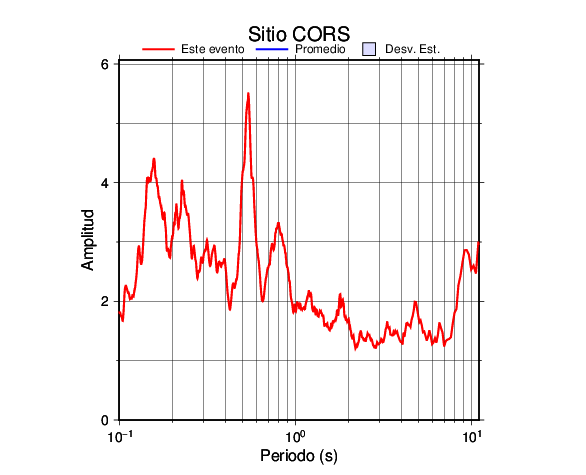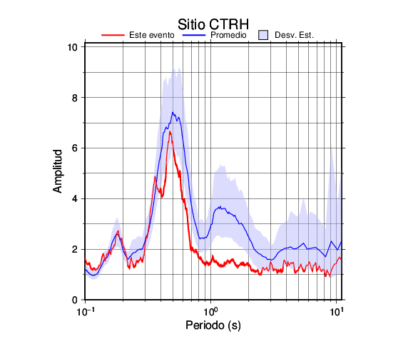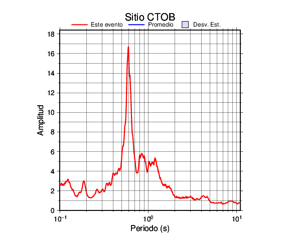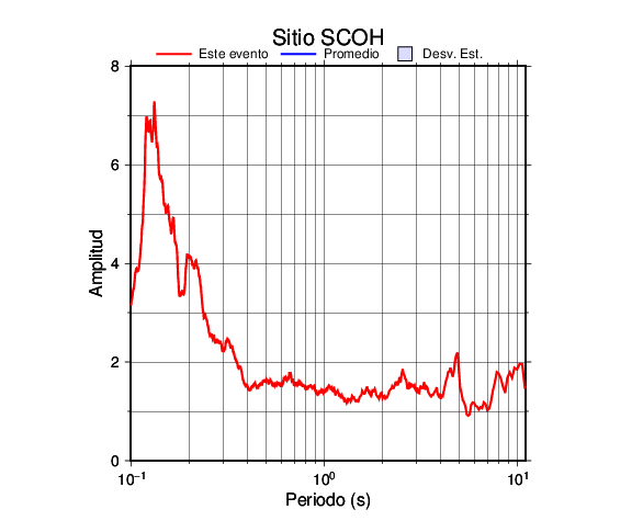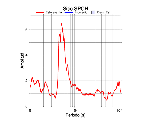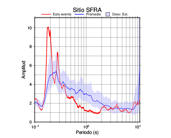 Los resultados que se presentan aquí fueron obtenidos luego de dividir las componentes horizontales entre la componente vertical (conocido como técnica H/V). Se grafica tanto el efecto de sitio del sismo registrado como el valor promedio en cada estación y su correspondiente desviación estándar.