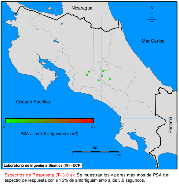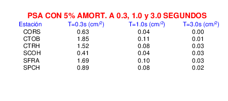 Estos mapas muestran los valores de la PSA en las distintas estacioes para los periodos de 0.3, 1.0 y 3.0 segundos