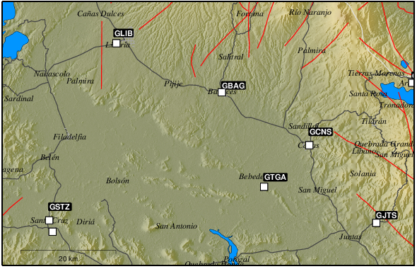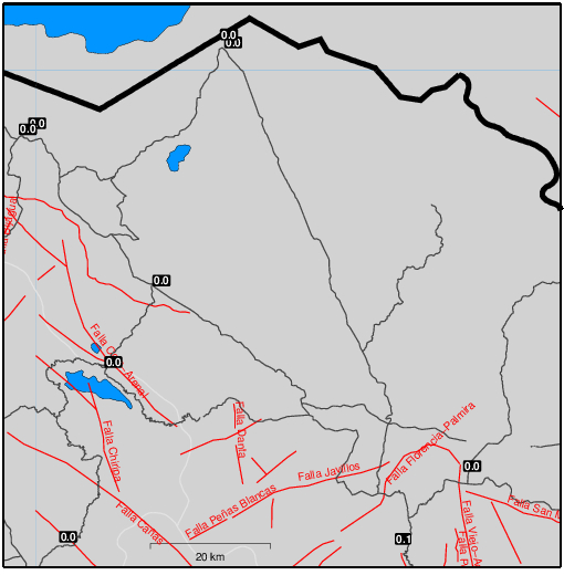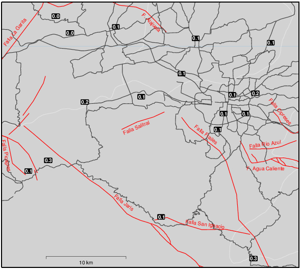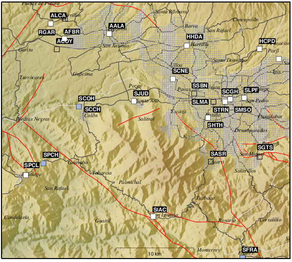Las estaciones también muestran el color de acuerdo a la escala de la intensidad de abajo. Zonas urbanas y carreteras principales se muestran en trazas grises. Las trazas rojas corresponden a fallas del Cuaternario (recientes o activas). Las trazas de color blanco son los límites de provincia.