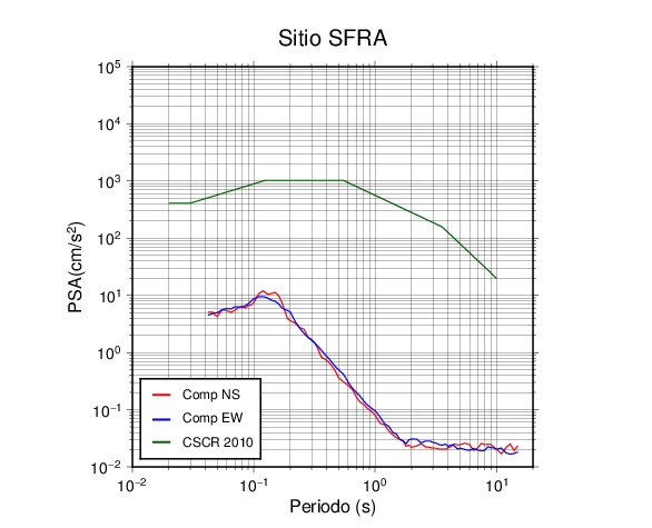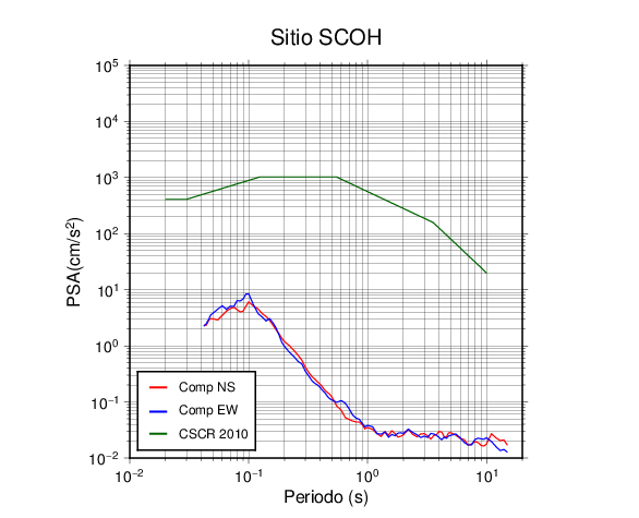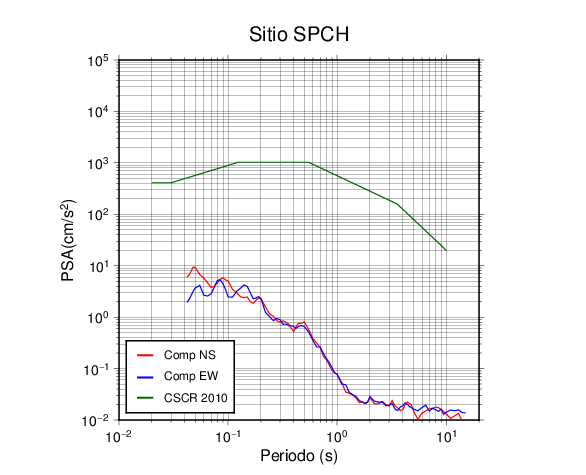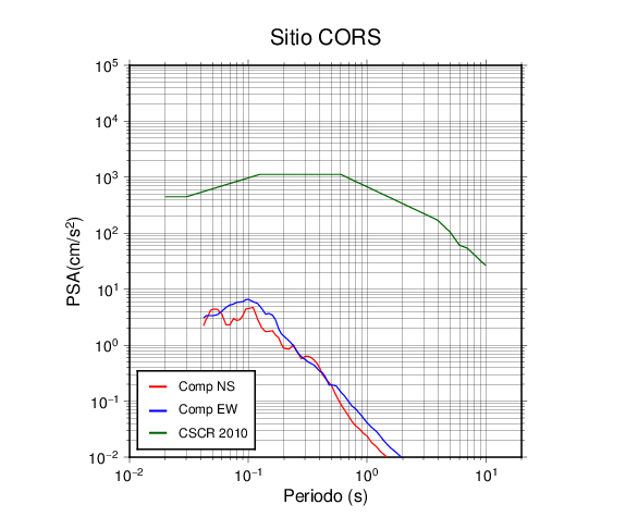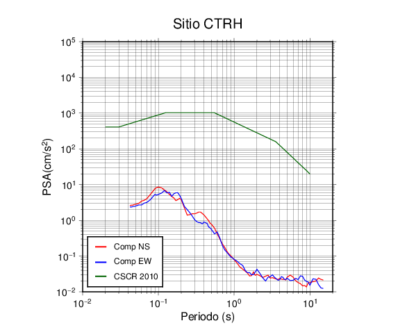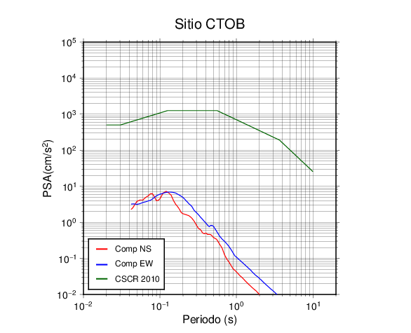 En los siguientes gráficos, la traza verde es el espectro propuesto por el CSCR-2010, la traza roja es el espectro de este sismo en la componente norte-sur (NS) y la traza azul la componente este-oeste (EW). El valor de la amplitud está dado en pseudoaceleración en cm/s2.
