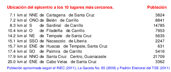 Mapa de la zona epicentral. Se muestran las poblaciones más cercanas al epicentro y fallas activas. Abajo están las distancias que hay del epicentro a cada uno de los diez sitios más cercanos y la cantidad de habitantes que poseen.