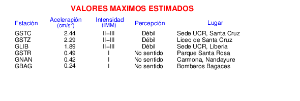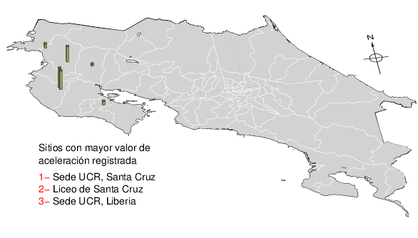 Intensidades en sitios de registro.Cada uno de los cuadrados en el mapa corresponde a la ubicación de un acelerógrafo al momento del sismo. Estos se muestran en distintos colores según la escala mostrada al pie de la figura.