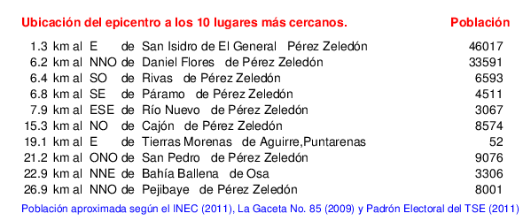 Mapa de la zona epicentral. Se muestran las poblaciones más cercanas al epicentro y fallas activas. Abajo están las distancias que hay del epicentro a cada uno de los diez sitios más cercanos y la cantidad de habitantes que poseen.