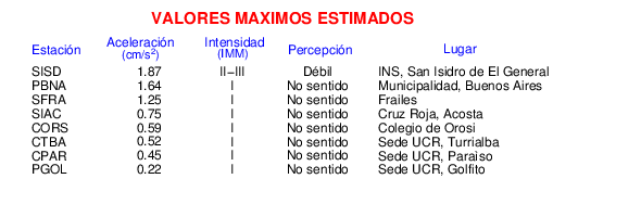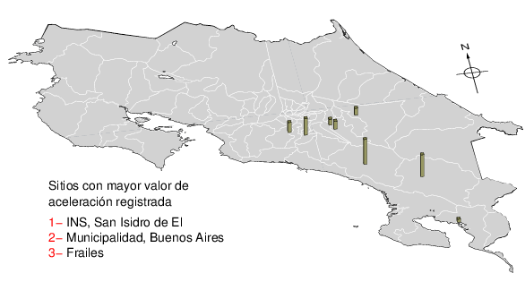 Intensidades en sitios de registro.Cada uno de los cuadrados en el mapa corresponde a la ubicación de un acelerógrafo al momento del sismo. Estos se muestran en distintos colores según la escala mostrada al pie de la figura.