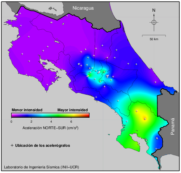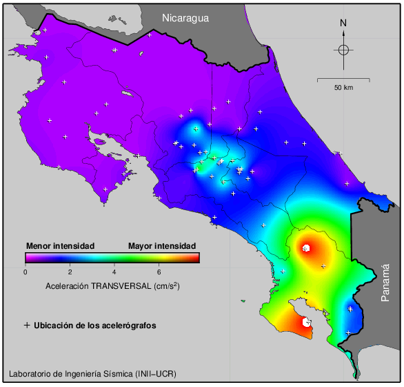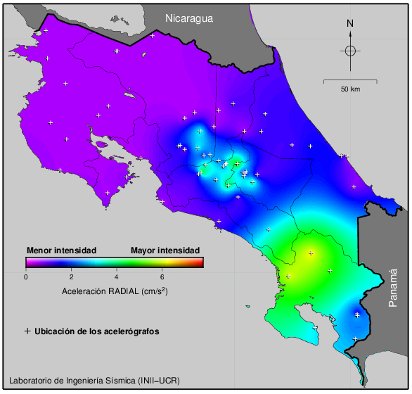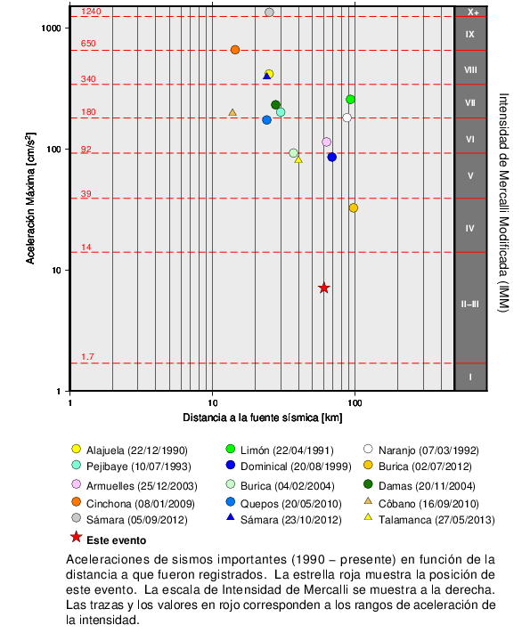 Estos son los valores de PGA de algunos sismos de importancia que han sucedido en Costa Rica desde 1990 hasta el presente. El sismo último es mostrado como una estrella roja. El más grande registrado ha sido el del 05 de setiembre del 2012 en Nicoya con una magnitud Mw 7.6. El del 22 de abril de 1991 en el Valle de la Estrella también fue igualmente grande, sin embargo, en ese entonces la cobertura de la red se limitaba al Valle Central, por lo que no se obtuvieron registros cerca del epicentro.