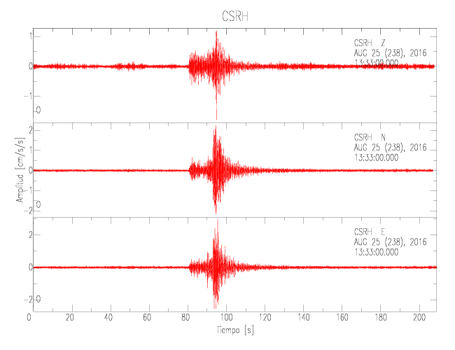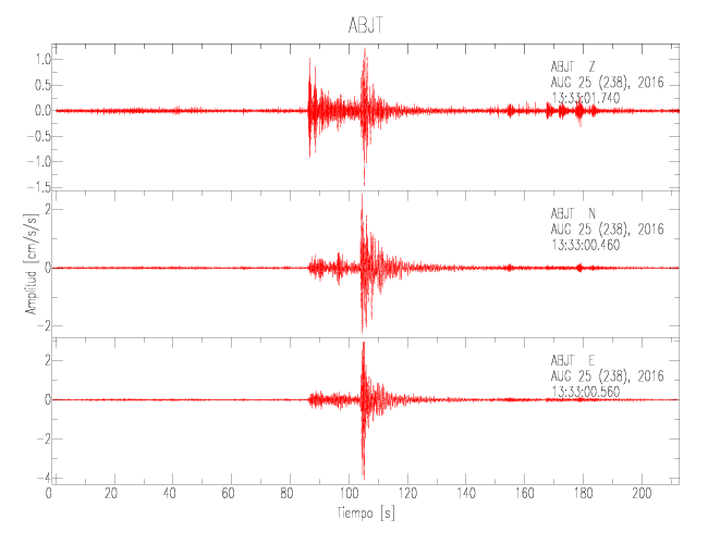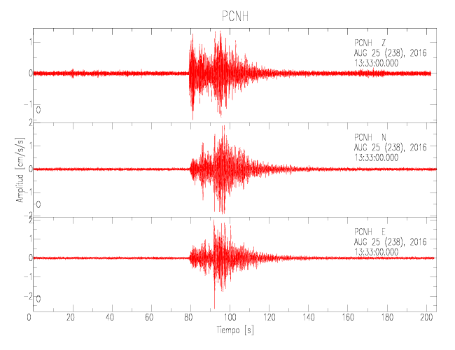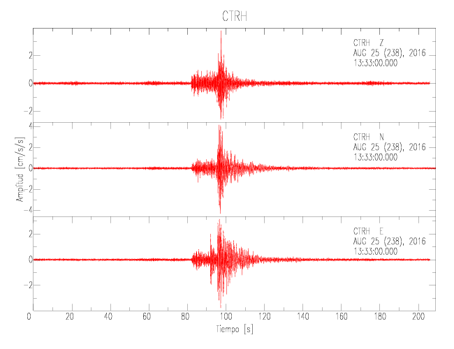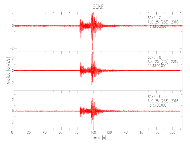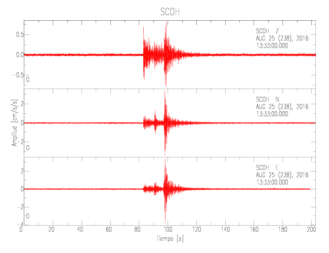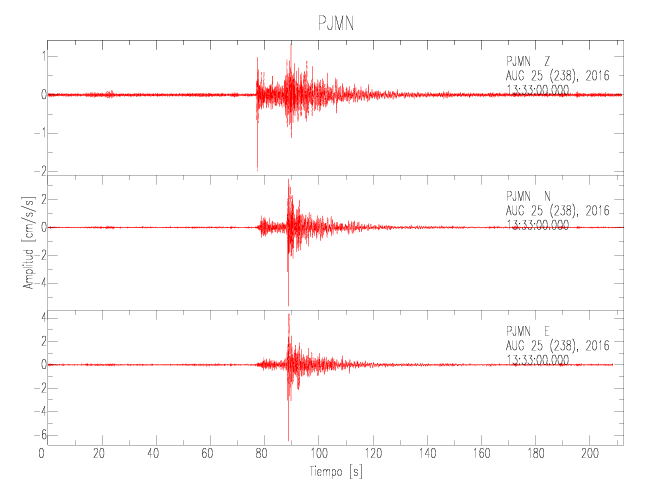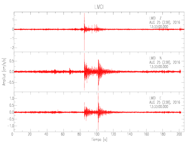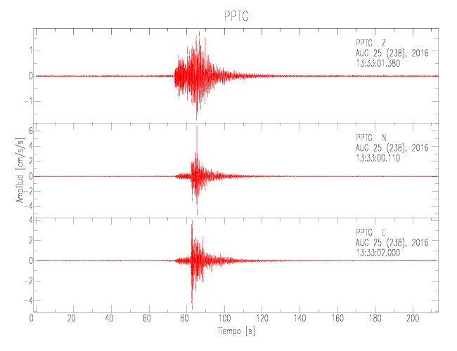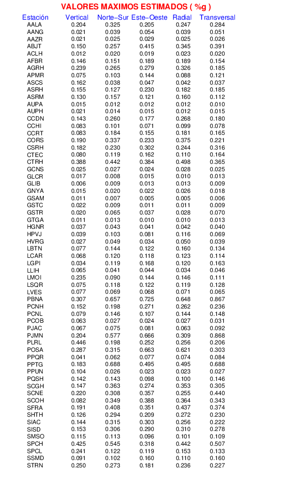 La siguiente tabla muestra los datos de aceleración máxima para cada componente en porcentaje de la aceleración de la gravedad (%g). Estos se obtienen dividiendo el valor del PGA registrado por 980 cm/s2 y multiplicándolo por 100. Las estaciones se listan en orden alfabético. Los valores de las últimas dos columnas corresponden a la componente radial y transversal.