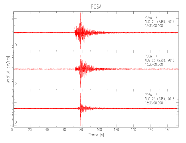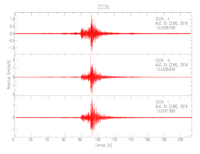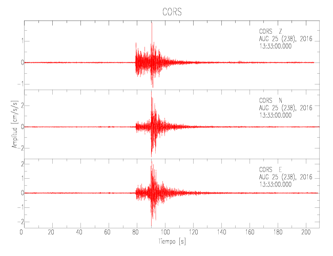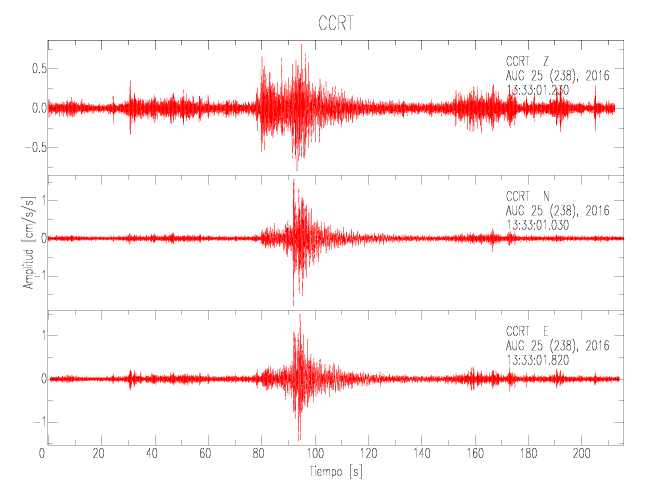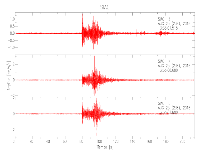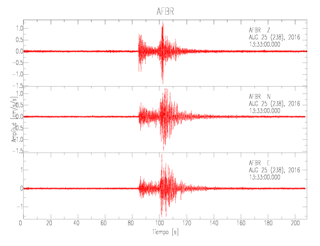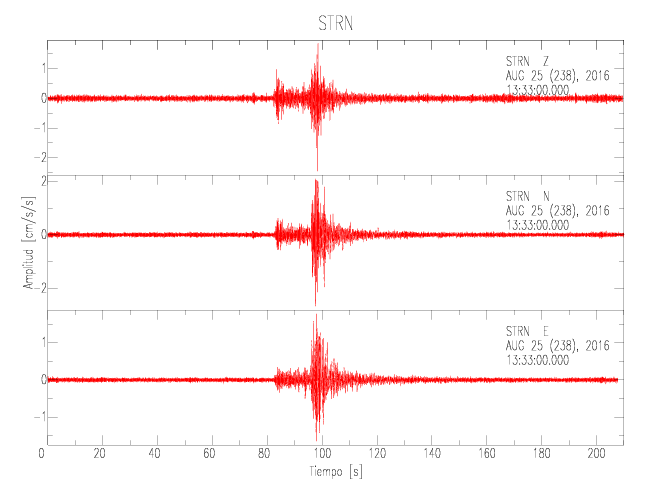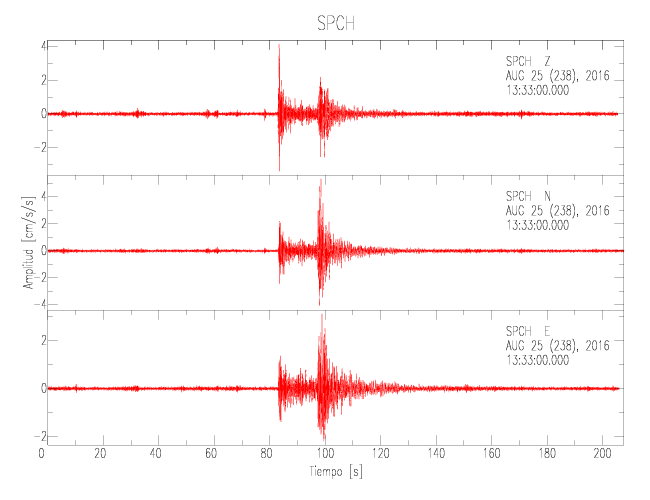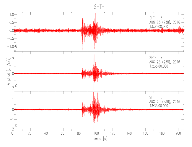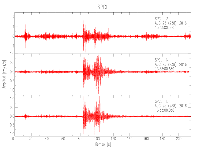 La siguiente tabla muestra los datos de aceleración máxima para cada componente en porcentaje de la aceleración de la gravedad (%g). Estos se obtienen dividiendo el valor del PGA registrado por 980 cm/s2 y multiplicándolo por 100. Las estaciones se listan en orden alfabético. Los valores de las últimas dos columnas corresponden a la componente radial y transversal.