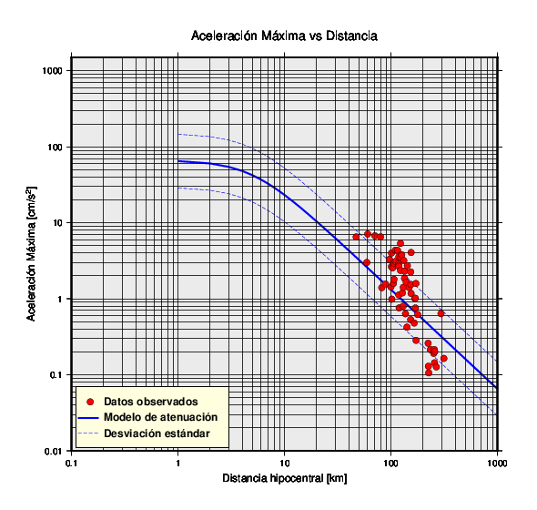 Datos del valor de la aceleración máxima (PGA por sus siglas en inglés) de cada estación (puntos rojos) en función de la distancia al hipocentro. Las trazas azules corresponden al modelo de atenuación y su respectiva desviación estándar.