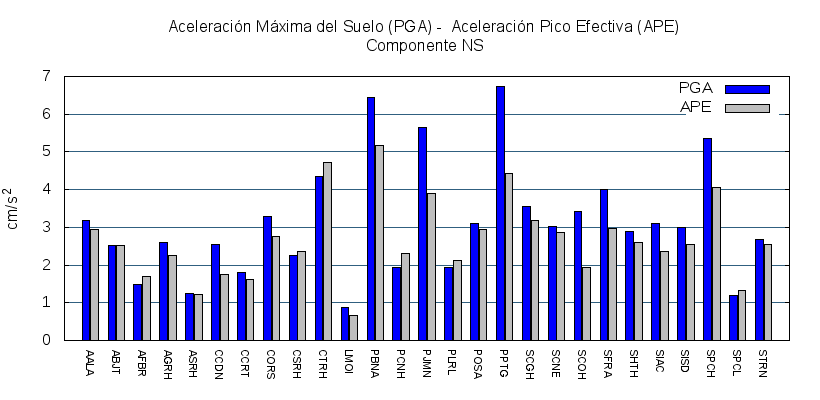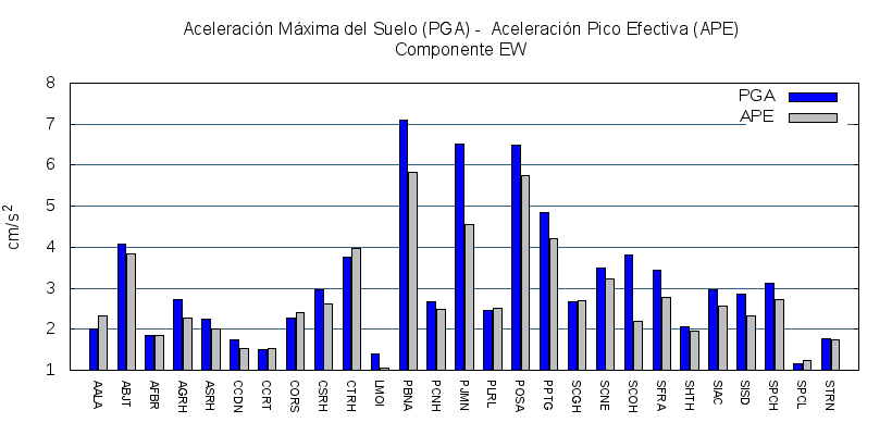 La siguiente tabla muestra los valores de aceleración efectiva para las componentes norte-sur (NS) y este-oeste (EW). También se muestra el valor del cociente entre la aceleración efectiva y la aceleración máxima (APE/PGA).