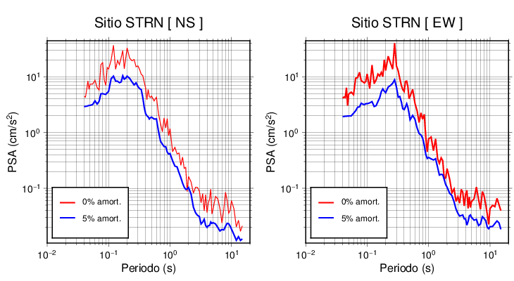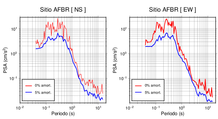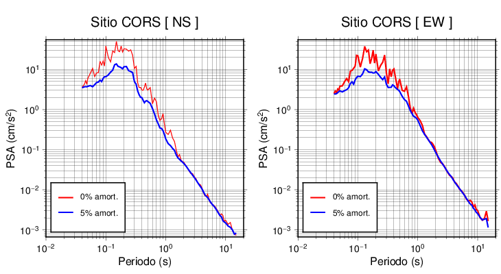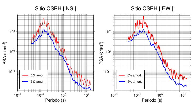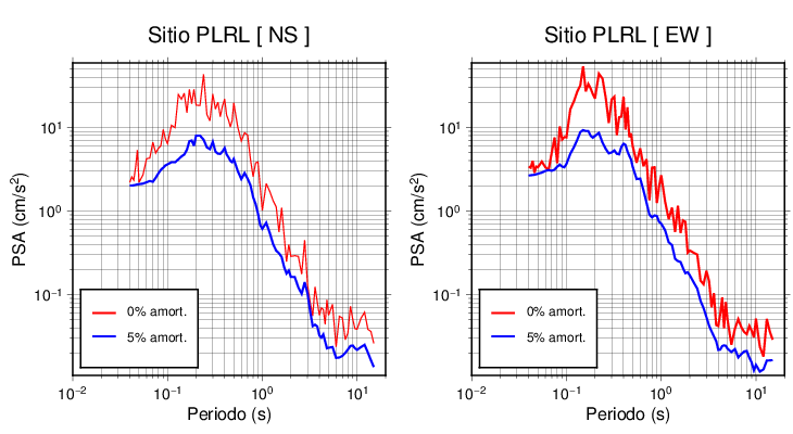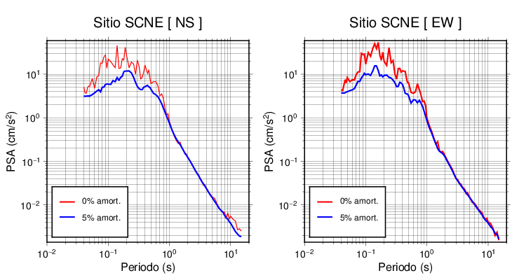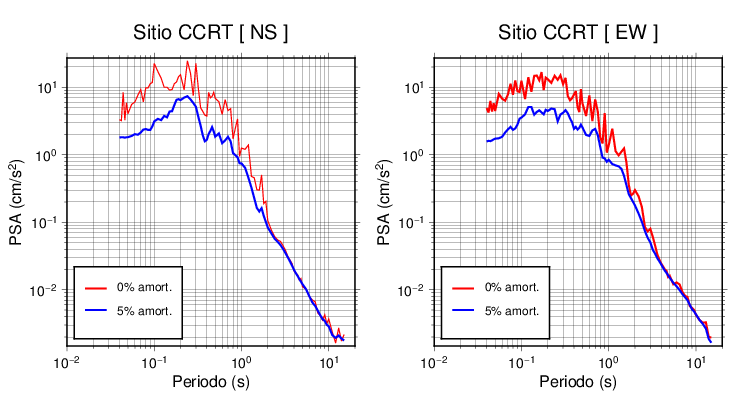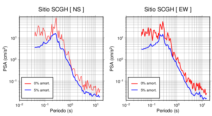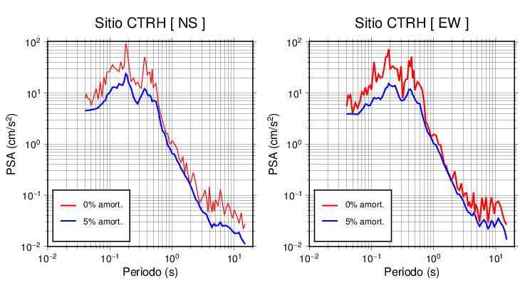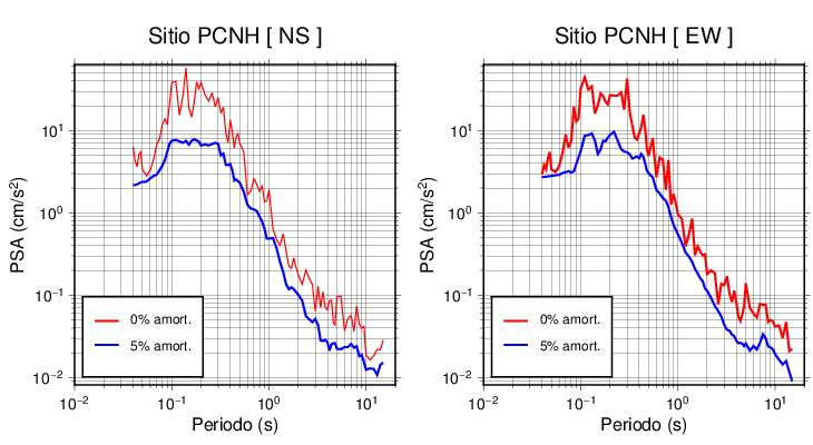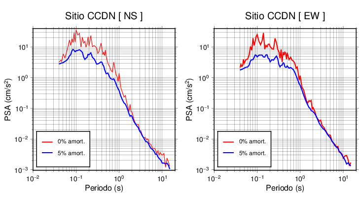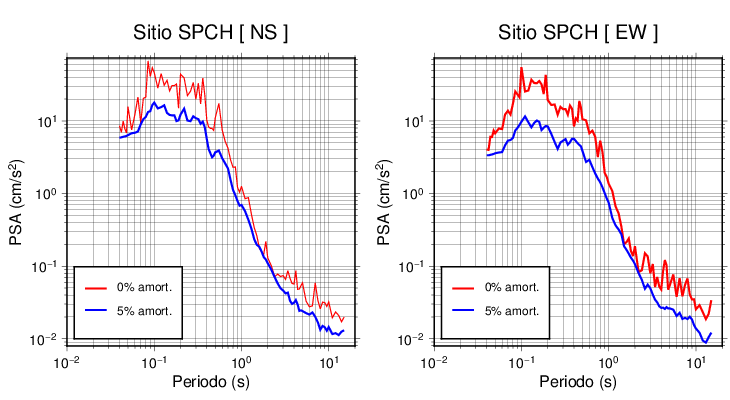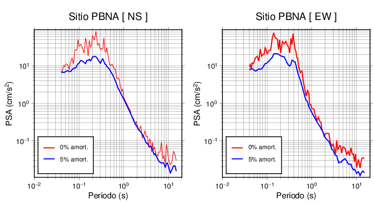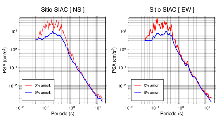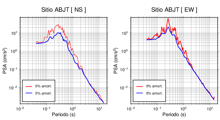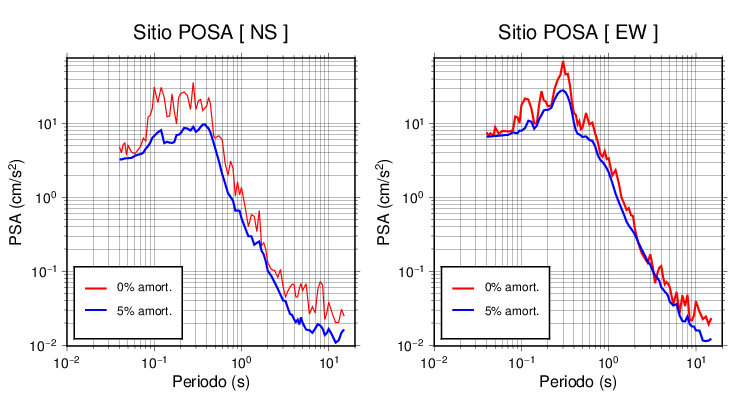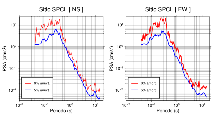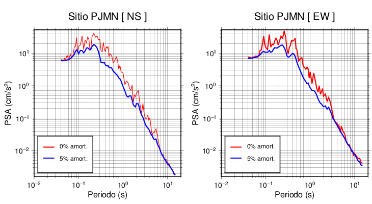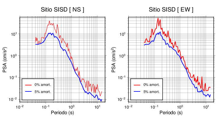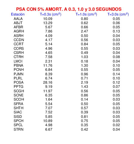 Las construcciones civiles generalmente poseen niveles de amortiguamiento en el rango de 2 a 7%. Para edificaciones normales, se asume que es de 5%. Esta tala contiene los valores de PSA en cm/s2 calculados del espectro de respuesta con 5% de amortiguamiento a 1 segundo.