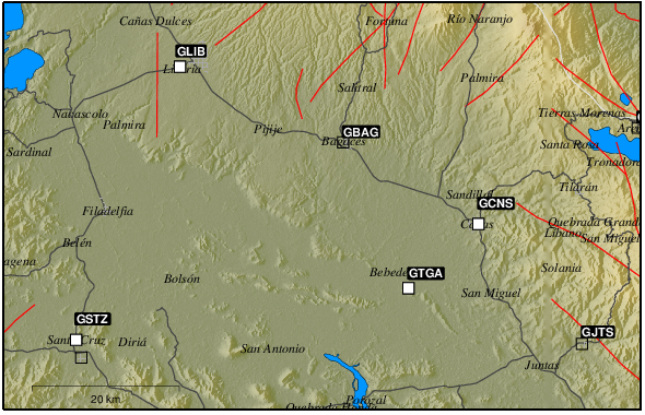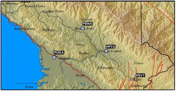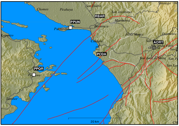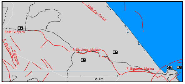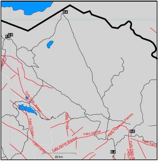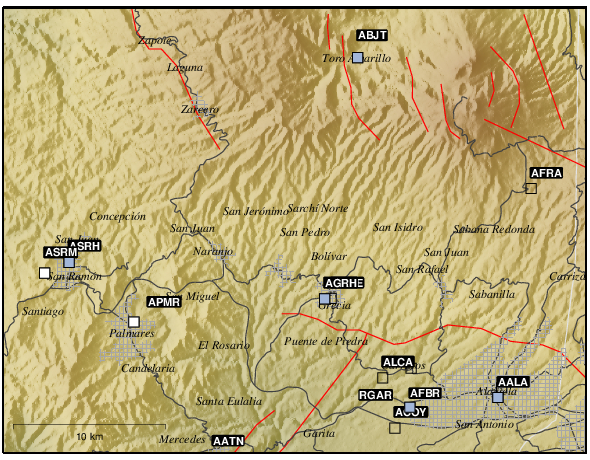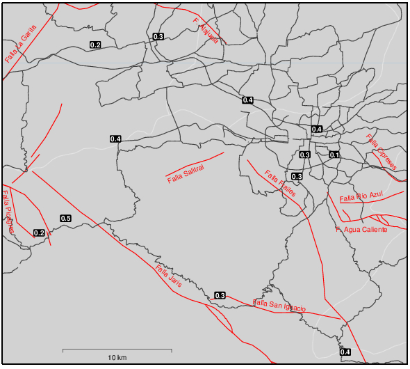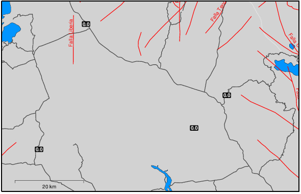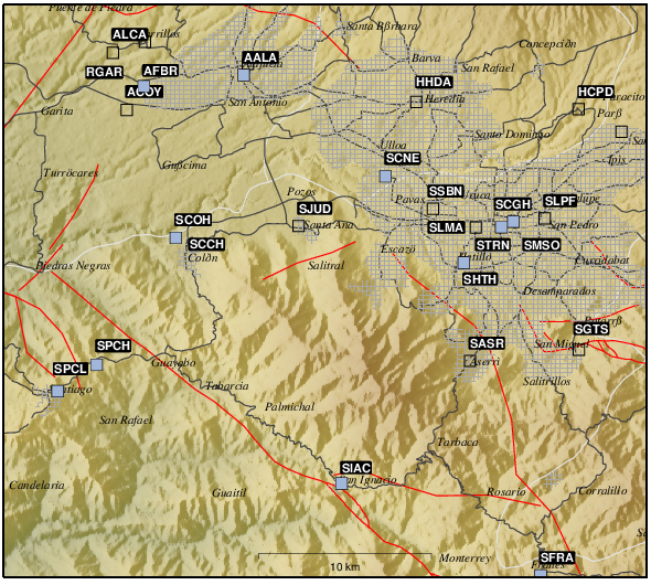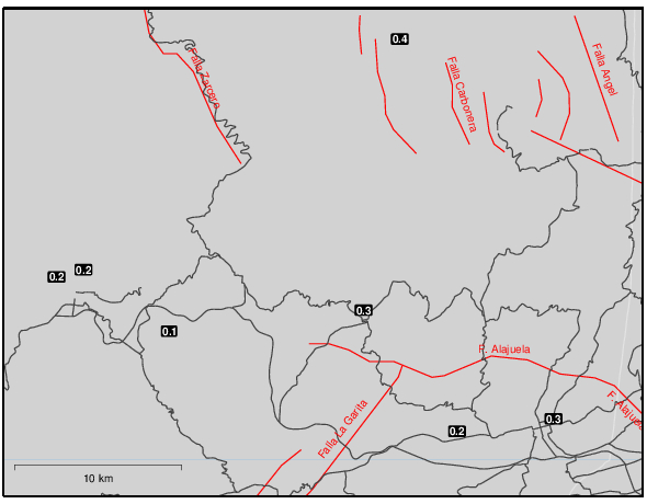 Las estaciones también muestran el color de acuerdo a la escala de la intensidad de abajo. Zonas urbanas y carreteras principales se muestran en trazas grises. Las trazas rojas corresponden a fallas del Cuaternario (recientes o activas). Las trazas de color blanco son los límites de provincia.