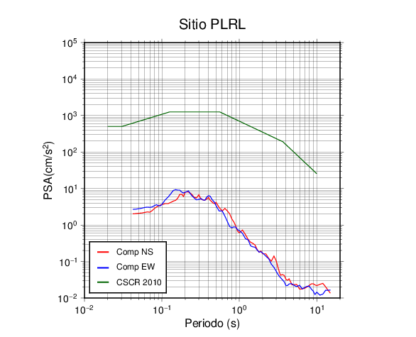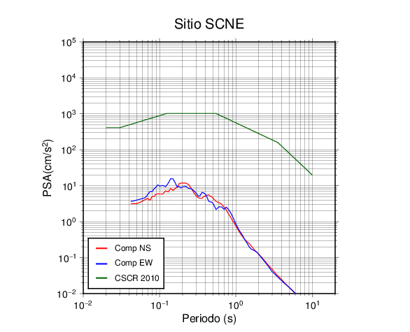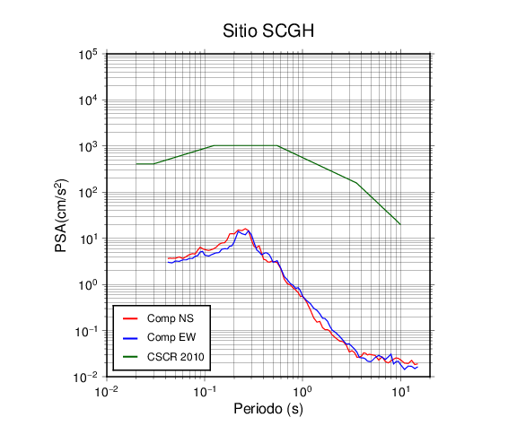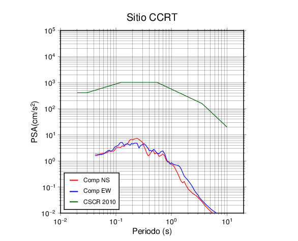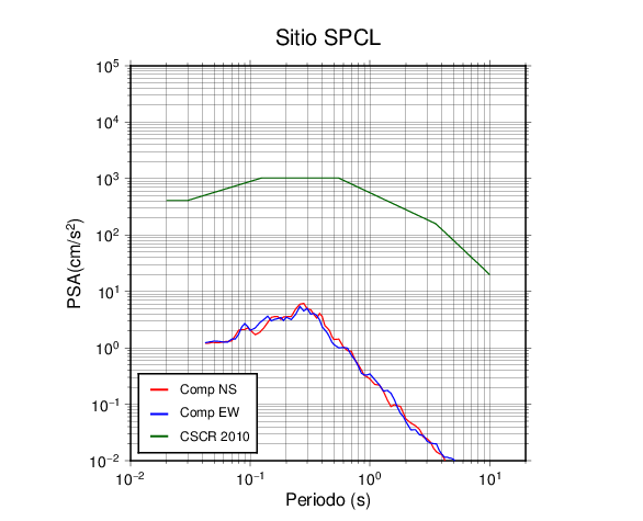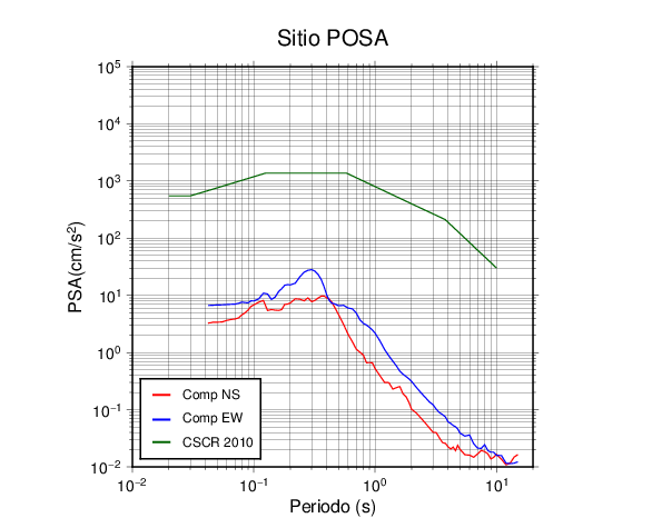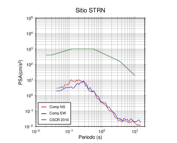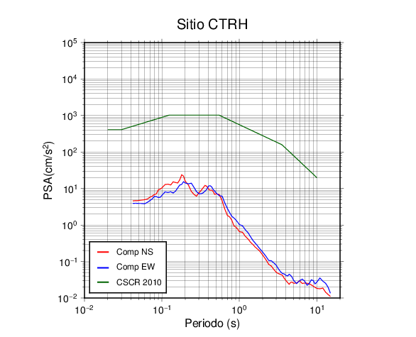 En los siguientes gráficos, la traza verde es el espectro propuesto por el CSCR-2010, la traza roja es el espectro de este sismo en la componente norte-sur (NS) y la traza azul la componente este-oeste (EW). El valor de la amplitud está dado en pseudoaceleración en cm/s2.