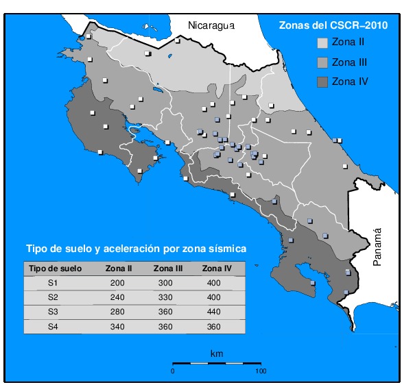 De acuerdo con el Código Sísmico de Costa Rica 2010 (CSCR-2010), el país se divide en tres zonas sísmicas de importancia denominadas: Zona II, Zona III y Zona IV. Estas se muestran en el siguiente mapa que también contienen los sitios de registro y los valores de aceleración para este sismo.