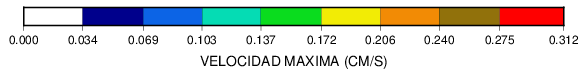 Mapa de valores de velocidad máxima. La estación que reportó el mayor valor de velocidad aparecerá en color rojo de acuerdo a la escala proporcionada al pie de la figura.