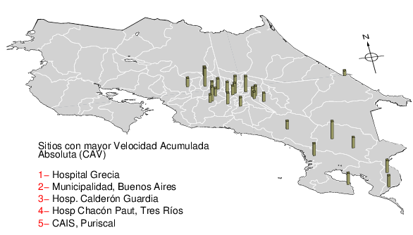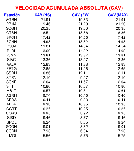 La velocidad acumulada absoluta (CAV por sus siglas en inglés) es otro parámetro que se usa para caracterizar el movimiento fuerte del suelo. Los datos están dados en cm/s para las componentes norte-sur (NS) y este-oeste (EW). El máximo de ambas se da en la tercera columna.