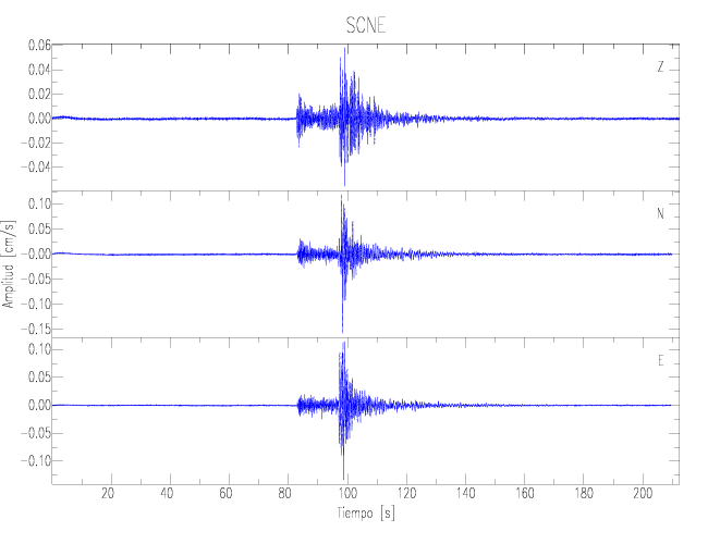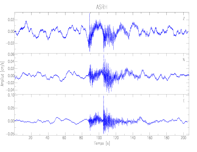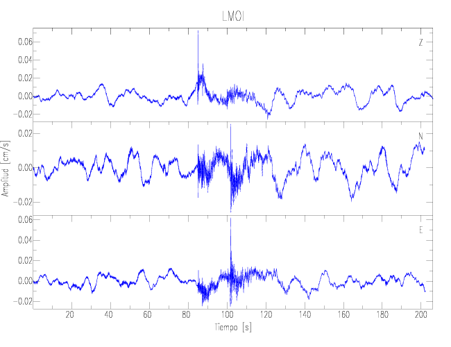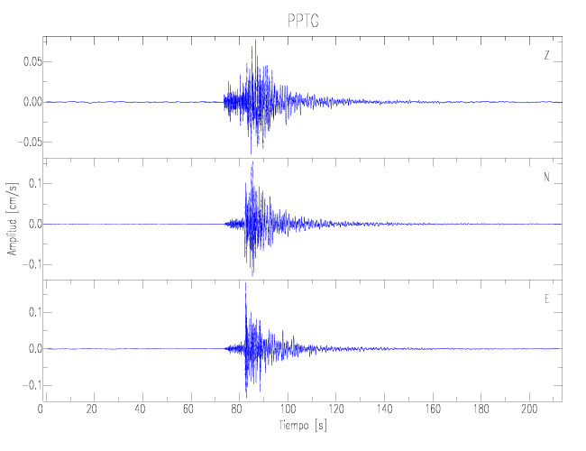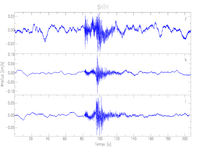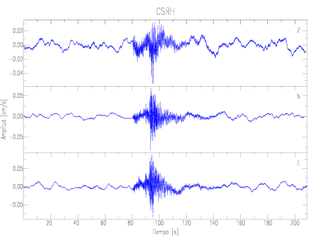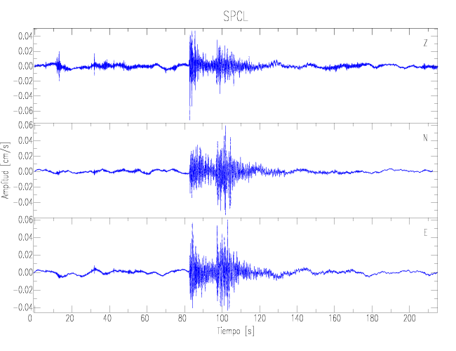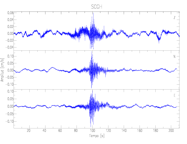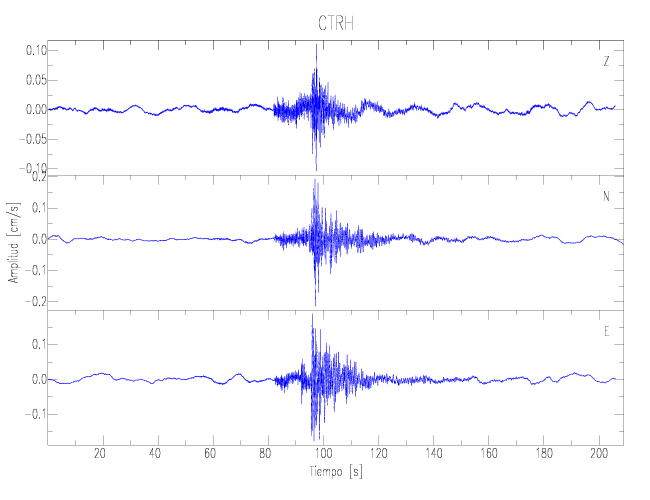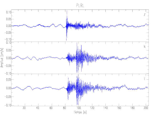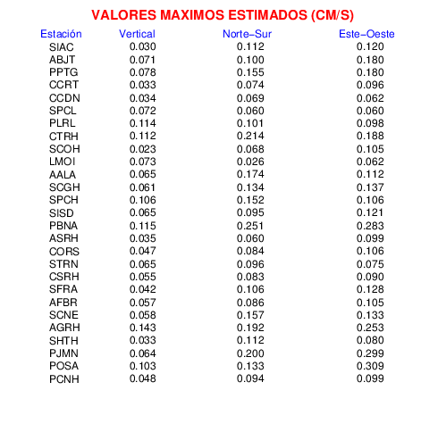 Los registros de velocidad se obtienen de la integración de los datos de aceleración. Esta tabla contiene los valores de velocidad máxima (PGV por sus siglas en inglés) para cada componente en cm/s. Las estaciones se listan en orden alfabético y corresponden a los sitios en que el nivel de aceleración fue superior a los 2 cm/s2.