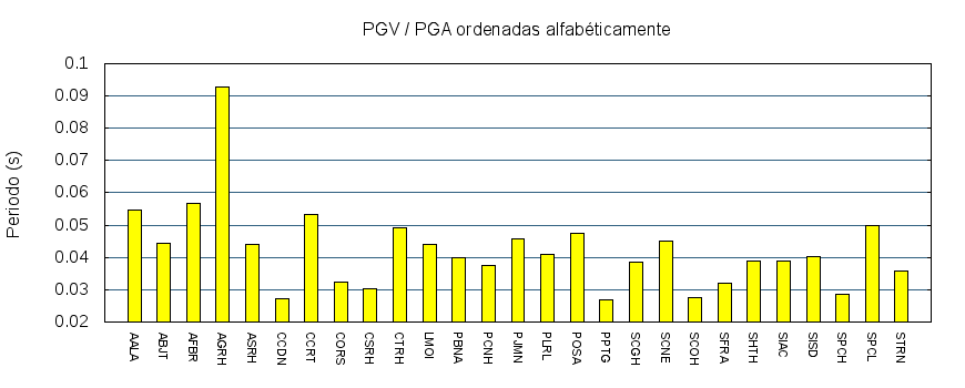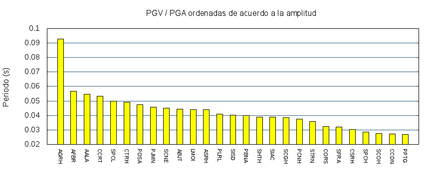 El cociente de la velocidad máxima (PGV) entre la aceleración máxima (PGA) brinda información de los periodos más significativos del movimiento del suelo. En el gráfico siguiente se muestran las estaciones ordenadas por su cercanía al epicentro. La más cercana está a la izquierda y la más lejana a la derecha. También se muestran los mismos datos en orden alfabético y ordenados de mayor a menor amplitud.
