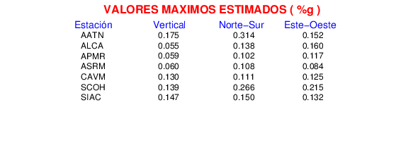 La siguiente tabla muestra los datos de aceleración máxima para cada componente en porcentaje de la aceleración de la gravedad (%g). Estos se obtienen dividiendo el valor del PGA registrado por 980 cm/s2 y multiplicándolo por 100.