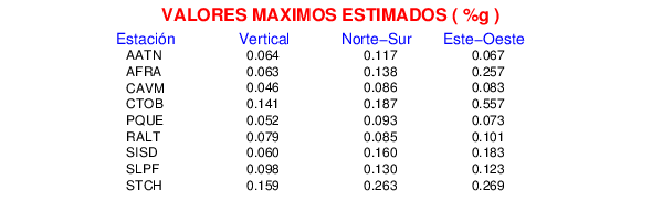 La siguiente tabla muestra los datos de aceleración máxima para cada componente en porcentaje de la aceleración de la gravedad (%g). Estos se obtienen dividiendo el valor del PGA registrado por 980 cm/s2 y multiplicándolo por 100.