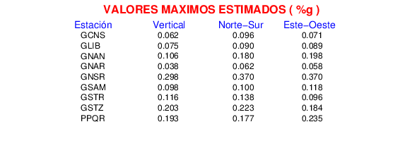 La siguiente tabla muestra los datos de aceleración máxima para cada componente en porcentaje de la aceleración de la gravedad (%g). Estos se obtienen dividiendo el valor del PGA registrado por 980 cm/s2 y multiplicándolo por 100.