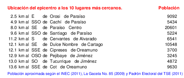 Mapa de la zona epicentral. Se muestran las poblaciones más cercanas al epicentro y fallas activas. Abajo están las distancias que hay del epicentro a cada uno de los diez sitios más cercanos y la cantidad de habitantes que poseen.