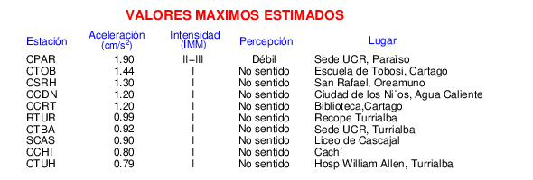 Intensidades en sitios de registro.Cada uno de los cuadrados en el mapa corresponde a la ubicación de un acelerógrafo al momento del sismo. Estos se muestran en distintos colores según la escala mostrada al pie de la figura.