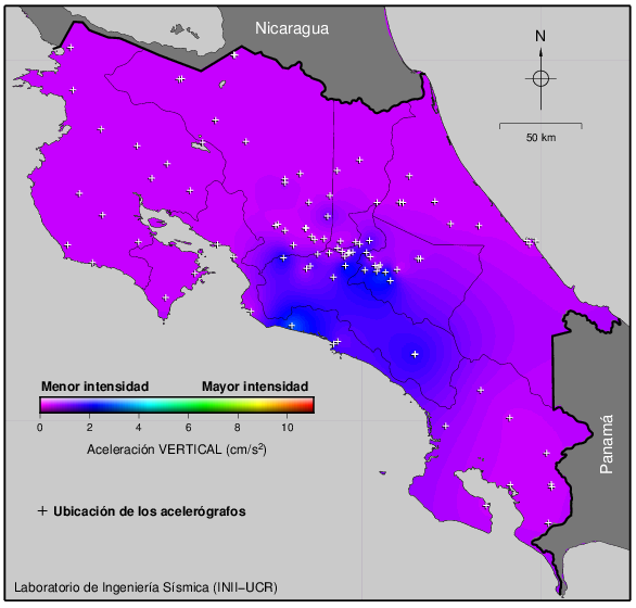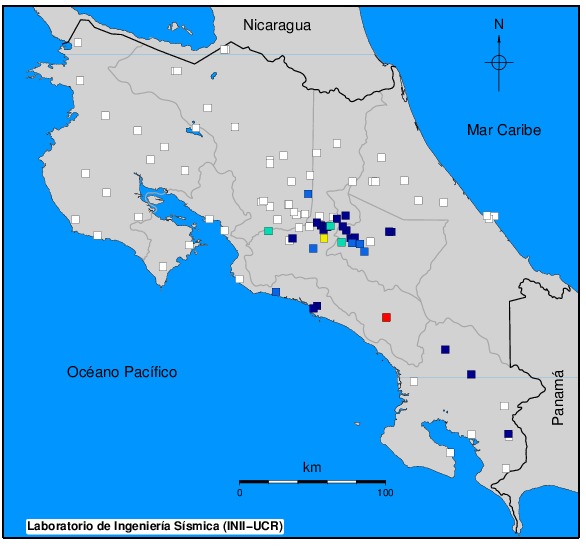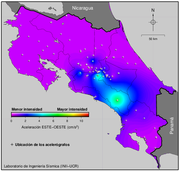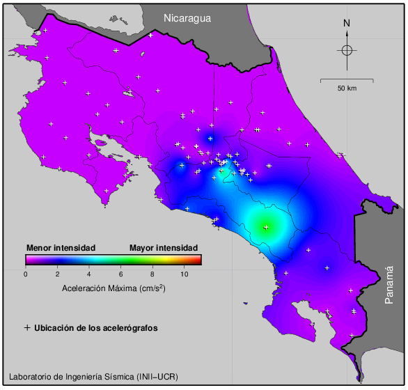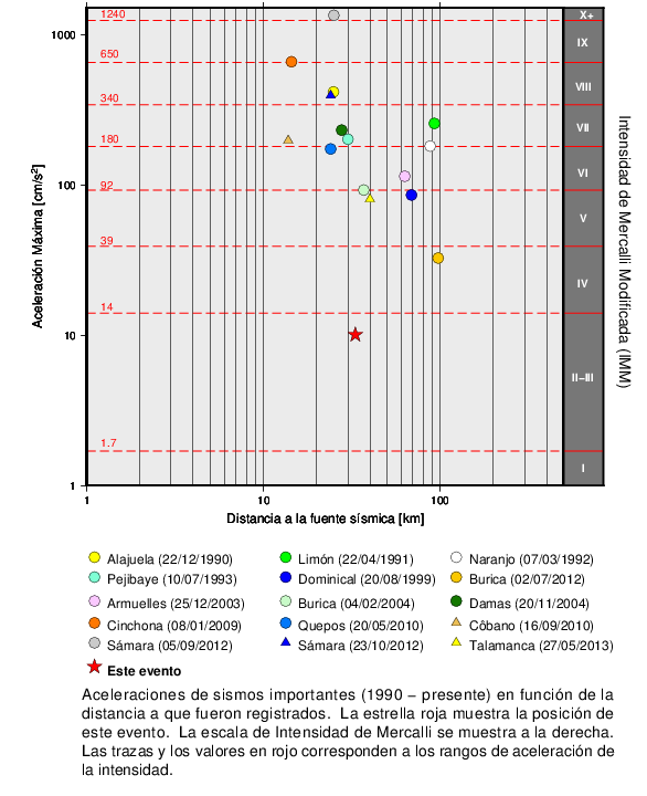 Estos son los valores de PGA de algunos sismos de importancia que han sucedido en Costa Rica desde 1990 hasta el presente. El sismo último es mostrado como una estrella roja. El más grande registrado ha sido el del 05 de setiembre del 2012 en Nicoya con una magnitud Mw 7.6. El del 22 de abril de 1991 en el Valle de la Estrella también fue igualmente grande, sin embargo, en ese entonces la cobertura de la red se limitaba al Valle Central, por lo que no se obtuvieron registros cerca del epicentro.