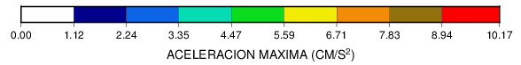 Mapa de valores de aceleración máximos. El mayor valor de aceleración aparecerá en color rojo de acuerdo a la escala proporcionada al pie de la figura.