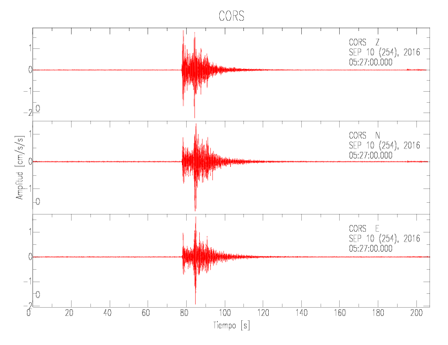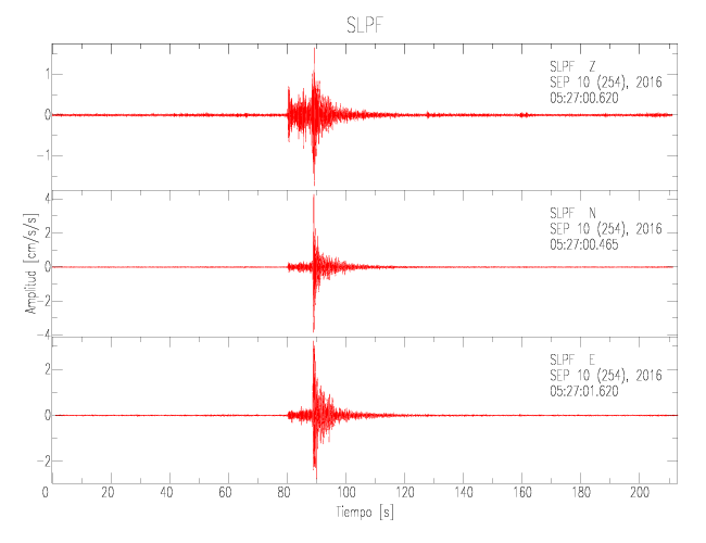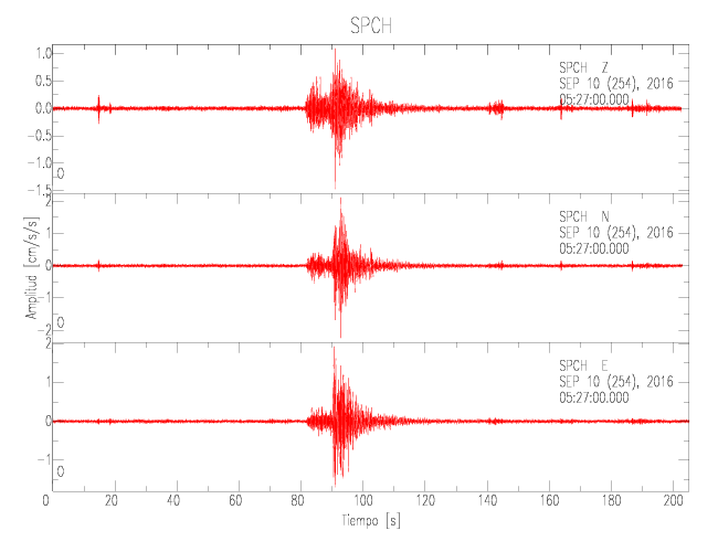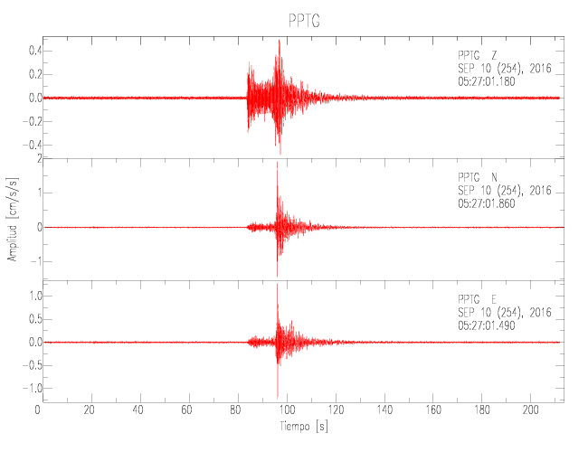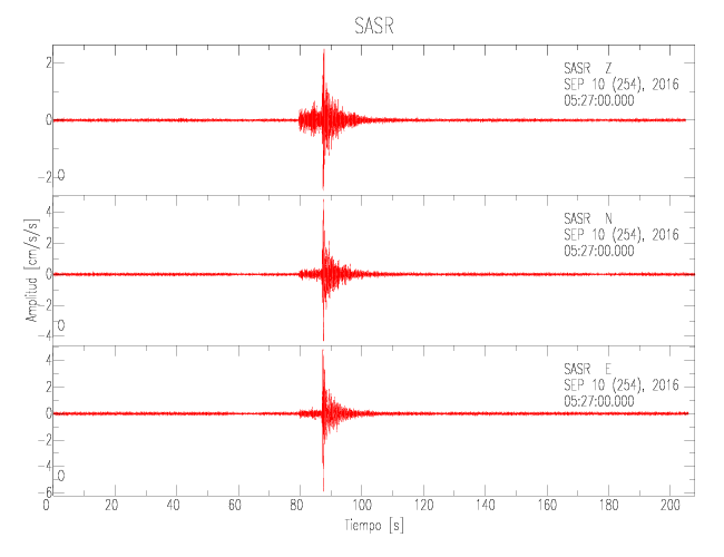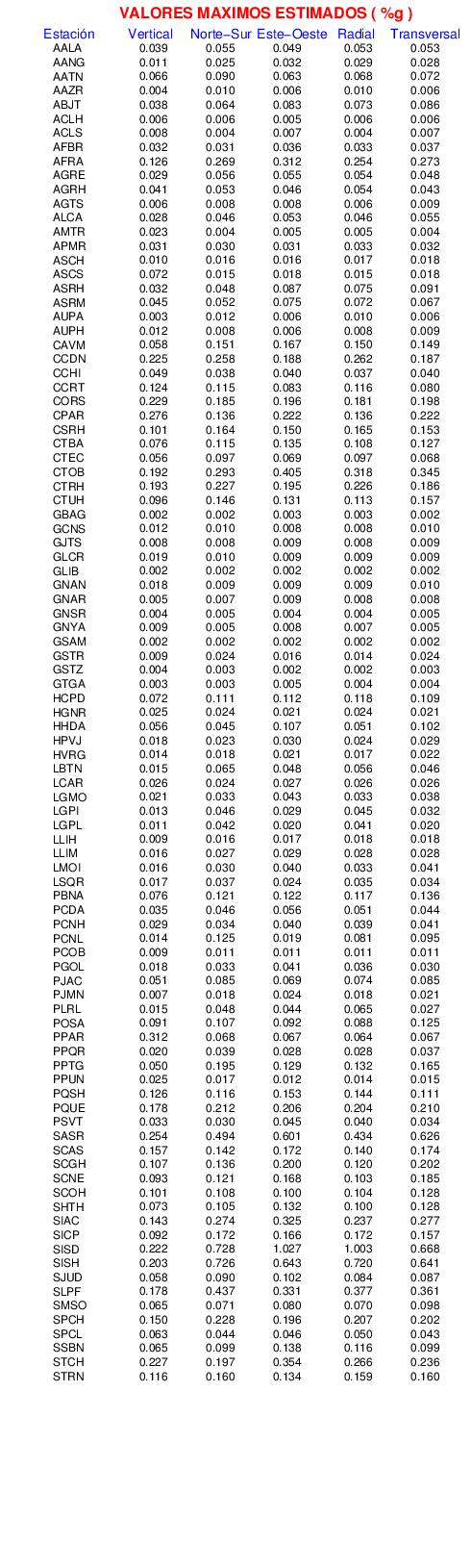 La siguiente tabla muestra los datos de aceleración máxima para cada componente en porcentaje de la aceleración de la gravedad (%g). Estos se obtienen dividiendo el valor del PGA registrado por 980 cm/s2 y multiplicándolo por 100. Las estaciones se listan en orden alfabético. Los valores de las últimas dos columnas corresponden a la componente radial y transversal.
