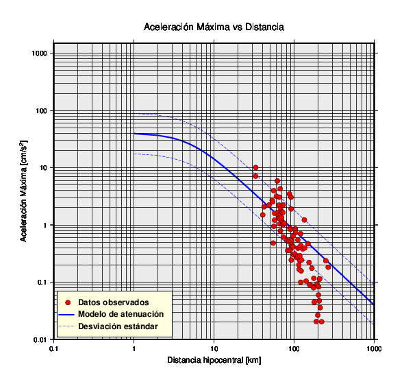 Datos del valor de la aceleración máxima (PGA por sus siglas en inglés) de cada estación (puntos rojos) en función de la distancia al hipocentro. Las trazas azules corresponden al modelo de atenuación y su respectiva desviación estándar.