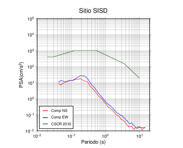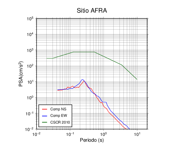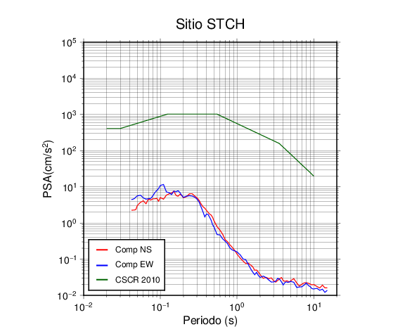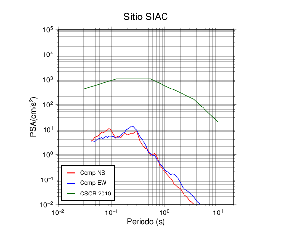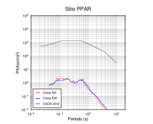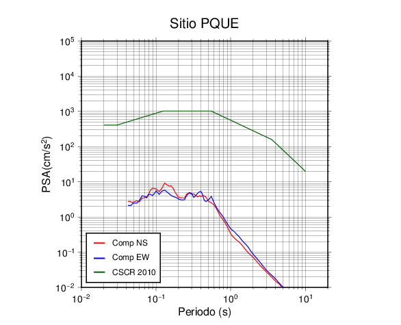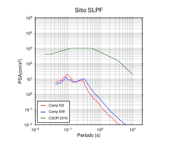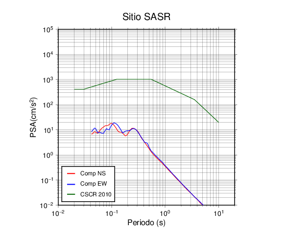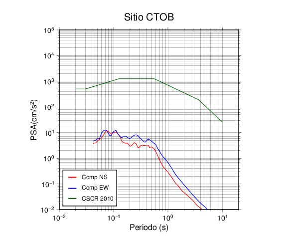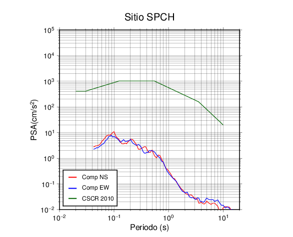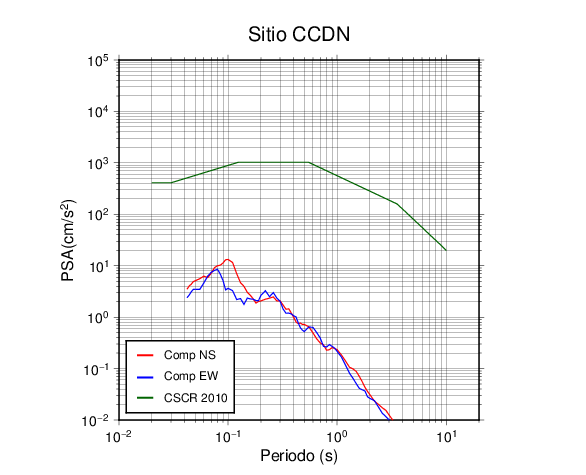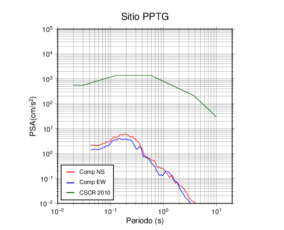 En los siguientes gráficos, la traza verde es el espectro propuesto por el CSCR-2010, la traza roja es el espectro de este sismo en la componente norte-sur (NS) y la traza azul la componente este-oeste (EW). El valor de la amplitud está dado en pseudoaceleración en cm/s2.