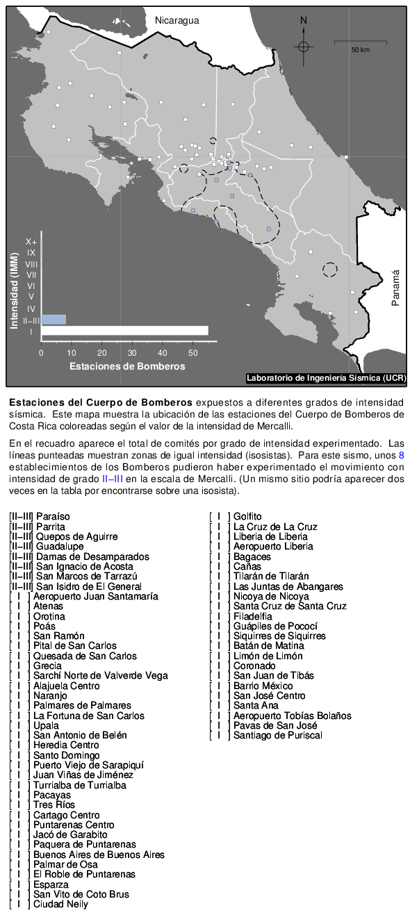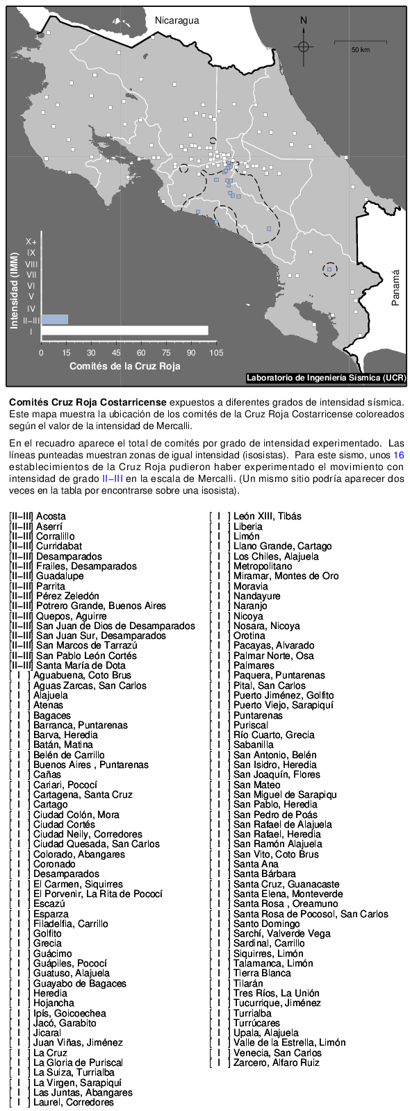 Cada punto sobre el mapa es la cabecera de un distrito. El número de habitantes que hay en cada uno se suma si se encuentra dentro de una misma zona de intensidad sísmica y el total se muestra en el recuadro en manera de porcentajes del total de la población y en miles de habitantes.