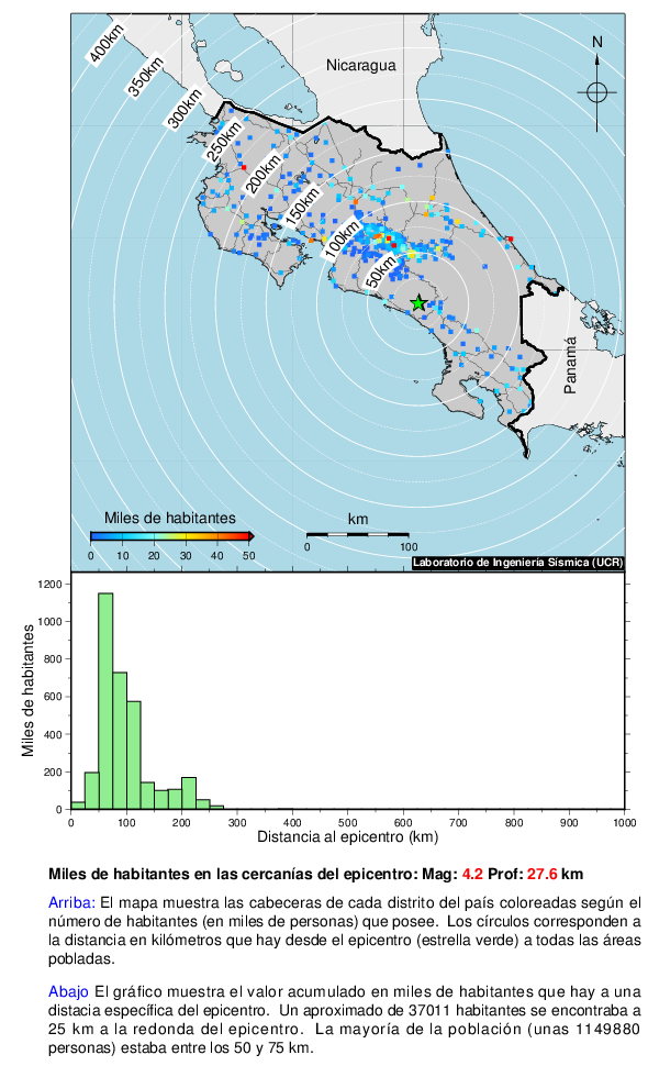 Este mapa muestra la ubicación del epicentro y la cantidad de habitantes que se encontraban a una cierta distancia de este. Los intervalos son de 25 km.
