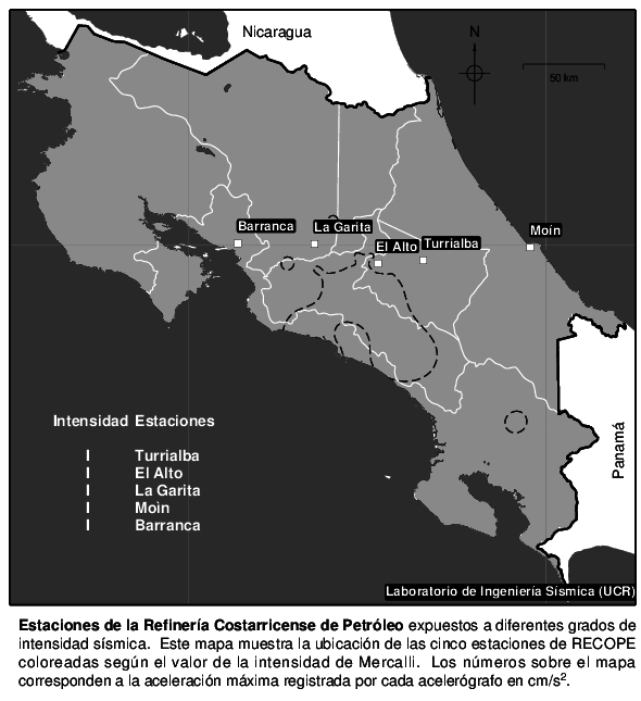 Este mapa se obtiene de las mediciones directas de aceleración máxima de los registros acelerográficos. Los datos de cada punto son interpolados y asociados a los correspondientes valores de intensidad sísmico en la escala de Mercalli.