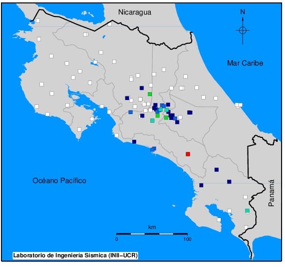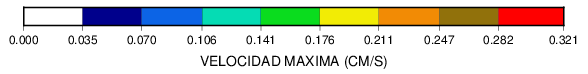 Mapa de valores de velocidad máxima. La estación que reportó el mayor valor de velocidad aparecerá en color rojo de acuerdo a la escala proporcionada al pie de la figura.
