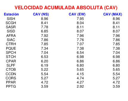 La velocidad acumulada absoluta (CAV por sus siglas en inglés) es otro parámetro que se usa para caracterizar el movimiento fuerte del suelo. Los datos están dados en cm/s para las componentes norte-sur (NS) y este-oeste (EW). El máximo de ambas se da en la tercera columna.