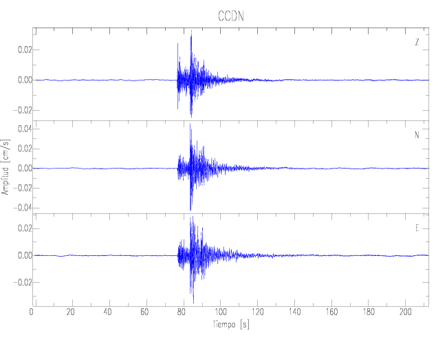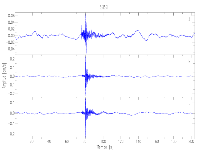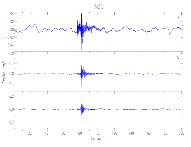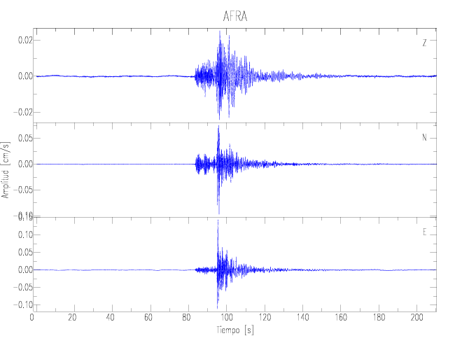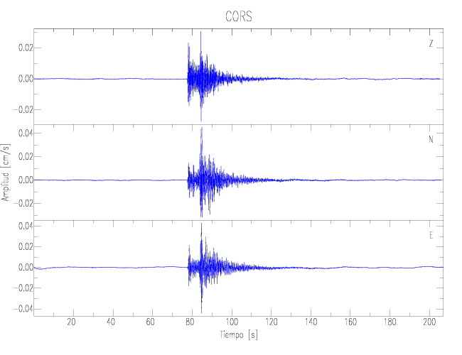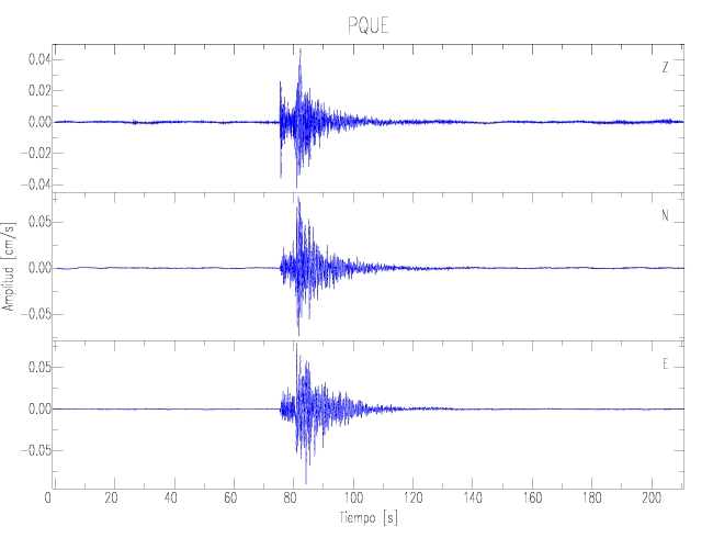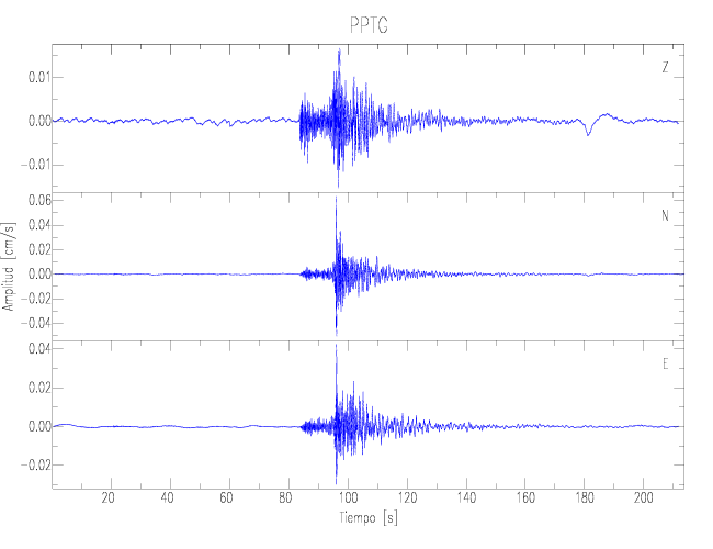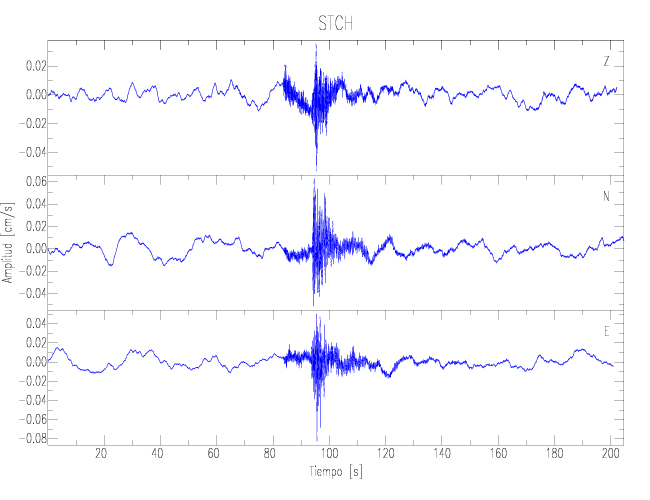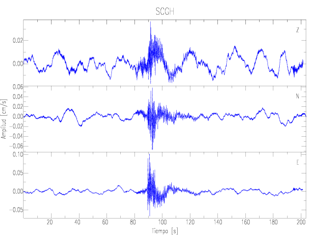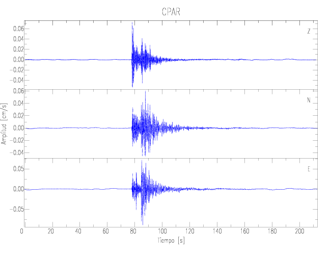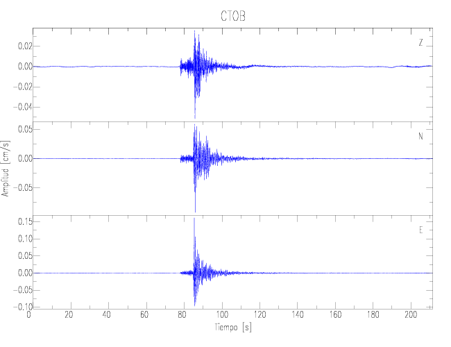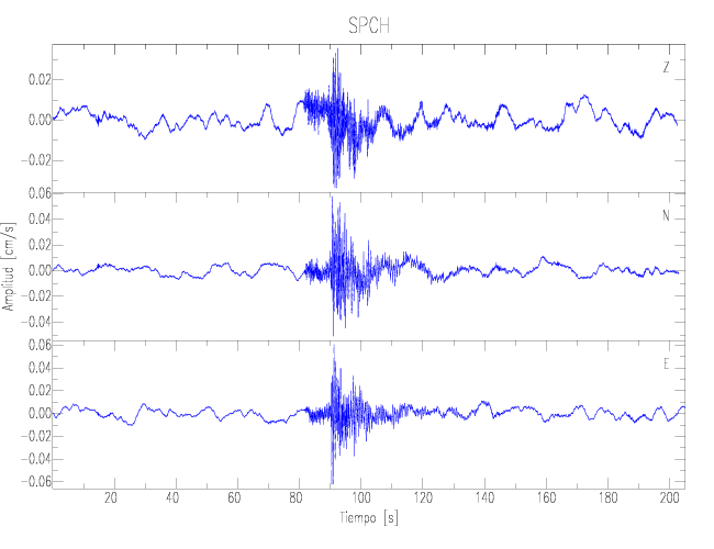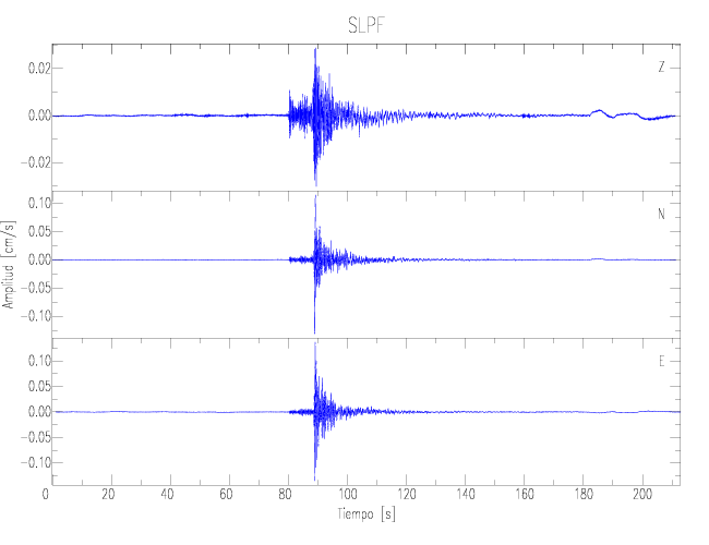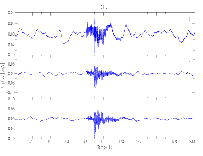 Los registros de velocidad se obtienen de la integración de los datos de aceleración. Esta tabla contiene los valores de velocidad máxima (PGV por sus siglas en inglés) para cada componente en cm/s. Las estaciones se listan en orden alfabético y corresponden a los sitios en que el nivel de aceleración fue superior a los 2 cm/s2.