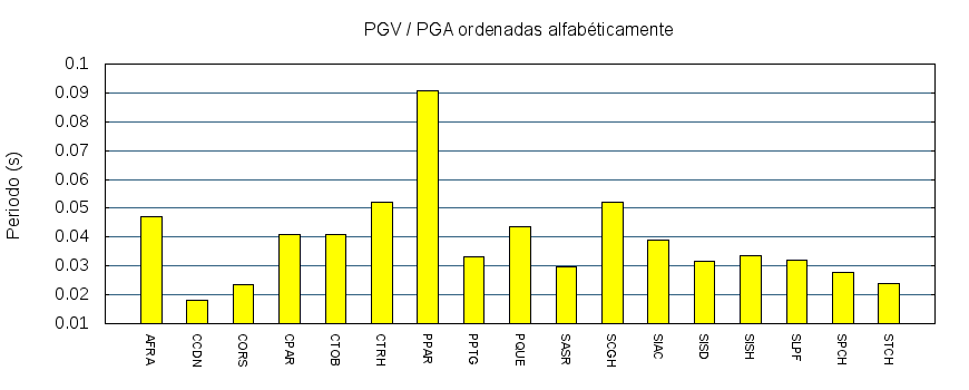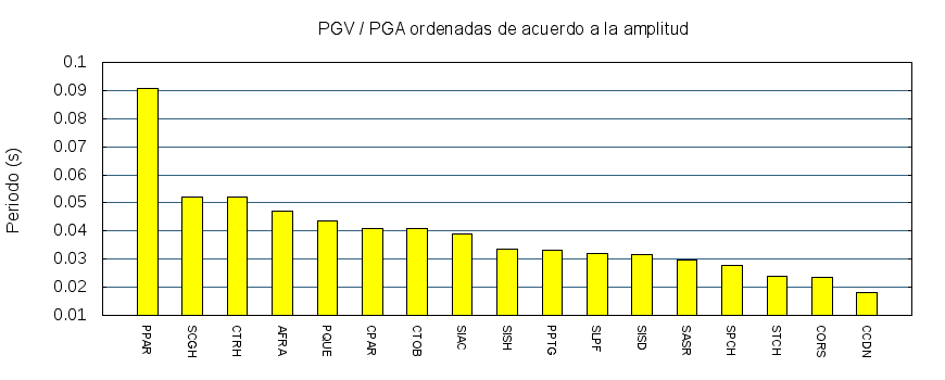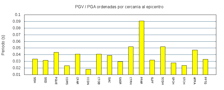 El cociente de la velocidad máxima (PGV) entre la aceleración máxima (PGA) brinda información de los periodos más significativos del movimiento del suelo. En el gráfico siguiente se muestran las estaciones ordenadas por su cercanía al epicentro. La más cercana está a la izquierda y la más lejana a la derecha. También se muestran los mismos datos en orden alfabético y ordenados de mayor a menor amplitud.