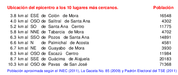 Mapa de la zona epicentral. Se muestran las poblaciones más cercanas al epicentro y fallas activas. Abajo están las distancias que hay del epicentro a cada uno de los diez sitios más cercanos y la cantidad de habitantes que poseen.