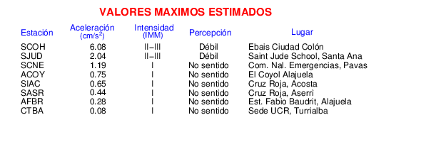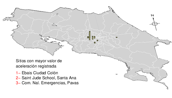 Intensidades en sitios de registro.Cada uno de los cuadrados en el mapa corresponde a la ubicación de un acelerógrafo al momento del sismo. Estos se muestran en distintos colores según la escala mostrada al pie de la figura.