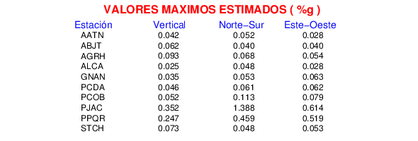 La siguiente tabla muestra los datos de aceleración máxima para cada componente en porcentaje de la aceleración de la gravedad (%g). Estos se obtienen dividiendo el valor del PGA registrado por 980 cm/s2 y multiplicándolo por 100.