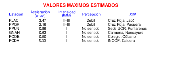 Intensidades en sitios de registro.Cada uno de los cuadrados en el mapa corresponde a la ubicación de un acelerógrafo al momento del sismo. Estos se muestran en distintos colores según la escala mostrada al pie de la figura.