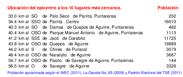 Mapa de la zona epicentral. Se muestran las poblaciones más cercanas al epicentro y fallas activas. Abajo están las distancias que hay del epicentro a cada uno de los diez sitios más cercanos y la cantidad de habitantes que poseen.