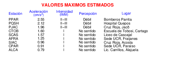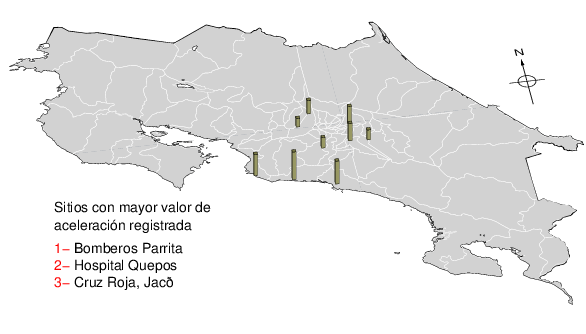 Intensidades en sitios de registro.Cada uno de los cuadrados en el mapa corresponde a la ubicación de un acelerógrafo al momento del sismo. Estos se muestran en distintos colores según la escala mostrada al pie de la figura.