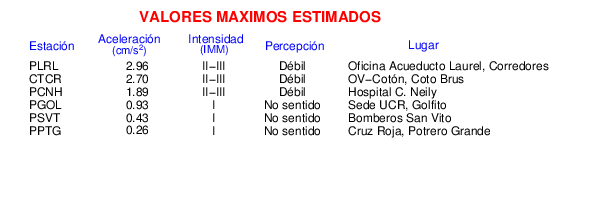 Intensidades en sitios de registro.Cada uno de los cuadrados en el mapa corresponde a la ubicación de un acelerógrafo al momento del sismo. Estos se muestran en distintos colores según la escala mostrada al pie de la figura.